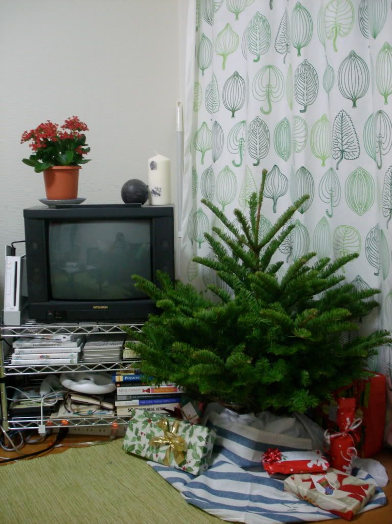 But not only did I buy a rug, I totally bought a Christmas tree. No kidding. I was kinda sad and figured I wouldn't really get to have a tree, but Ikea had tiny trees for only 2000 yen, and not only THAT, but you get a coupon, and after January 5th, you can take the tree back with the coupon and they give you 2000 yen store credit. Basically I get a free Christmas tree, that happens to be the perfect size and it's just so cute sitting in the corner next to my tv....haha...I was so happy and giddy picking it out. It was pretty funny. I also bought a Christmas tin with ginger snaps in it and it's really cute.